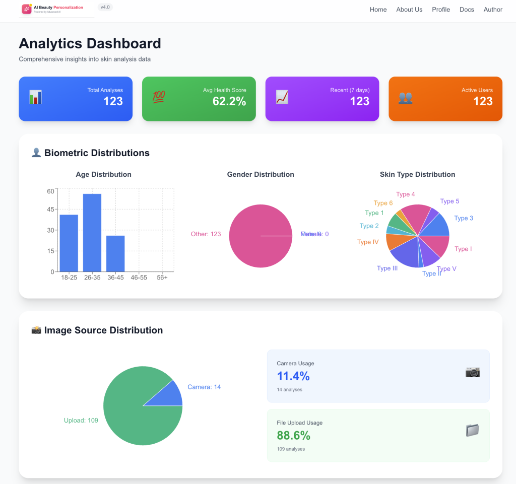- Biometrics: Charts showing the distribution of users by Age, Gender, and Skin Type.