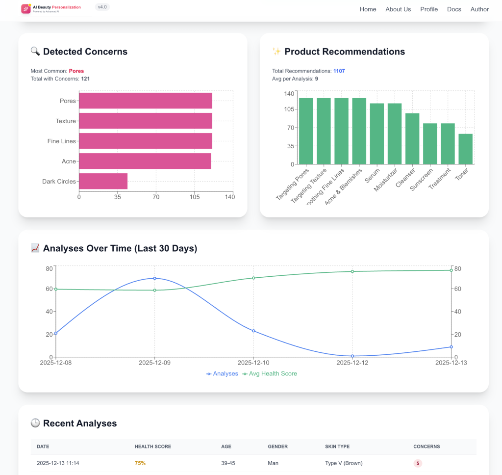 - Insights: The most common skin concerns detected (e.g., Acne, Fine Lines) and top product recommendations.